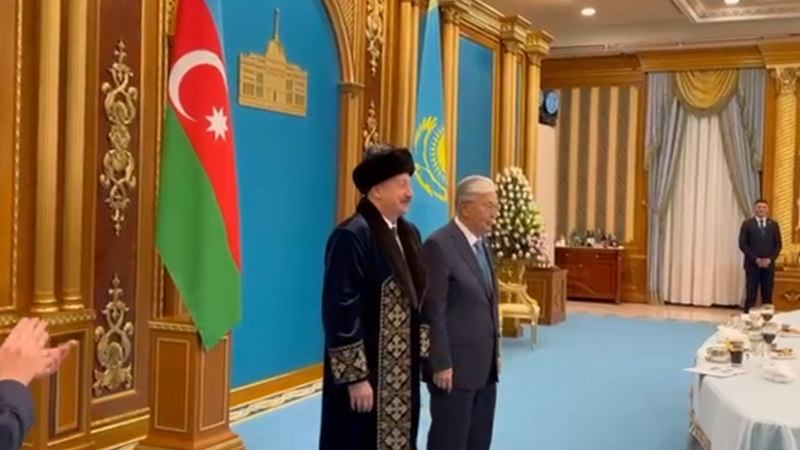 Qazaxıstanda səfərdə olan Azərbaycan Prezidenti İlham Əliyevə qazax xalqının milli geyimi hədiyyə edilib.